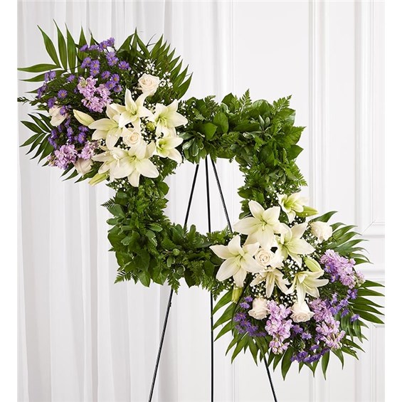 Celebrate the cherished memories you shared with a beautiful floral arrangement. Our unique design features a square wreath of greenery—perfect for displaying a photo—and two sprays on each end gathered with soothing lavender & white blooms for a lush, full presentation. It’s a special tribute to honor the life of a loved one.